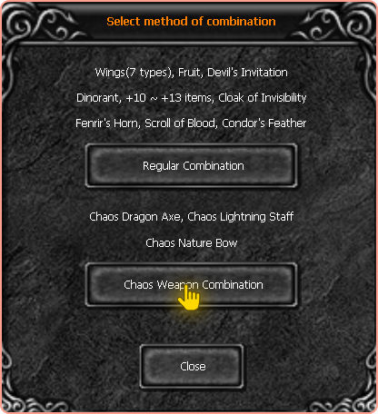 In the Chaos Machine options, you will choose the second combination option called CHAOS WEAPON COMBINATION. See the example below indicating where you should click: