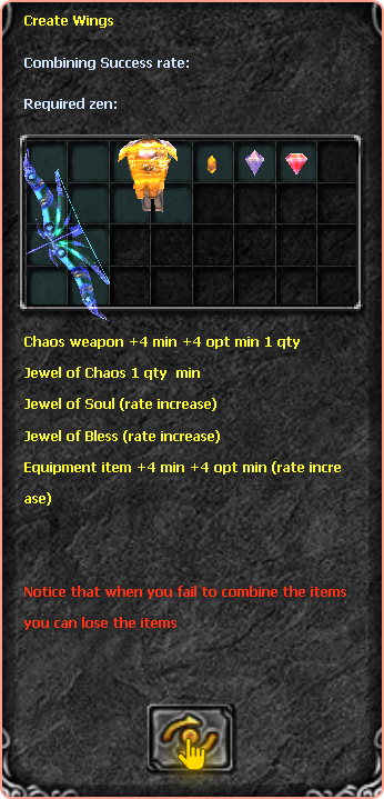Now, with the Chaos weapon in hand, you can create your level 1 wing. For the combination of the wing, you will need the following ingredients below: