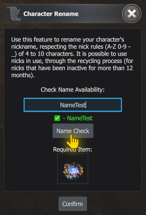 Để thực hiện thay đổi này, điều cần thiết là bạn phải sở hữu vật phẩm có tên Đổi tên nhân vật trong vé, vật phẩm này trở thành bắt buộc đối với mỗi thay đổi được thực hiện.