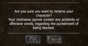 Khi xác nhận tên mới, hộp thoại xác nhận sẽ hiển thị ở bước thứ hai, kèm theo cảnh báo rằng việc sử dụng tên không phù hợp hoặc tên xúc phạm người chơi khác có thể bị trừng phạt, bao gồm cả việc khóa tài khoản mà không báo trước. Nếu bạn đồng ý với các điều khoản này, chỉ cần nhấp vào OK để tiếp tục.
